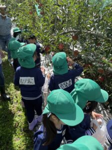 事前に、りんごの種類や取り方を練習していきました。実際に見る真っ赤なりんごに大興奮!赤くて立派な『あきばえ』をとるみんなのほっぺも可愛く赤くなっていました。