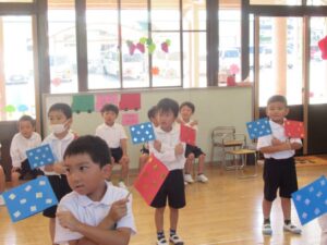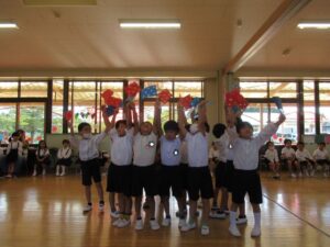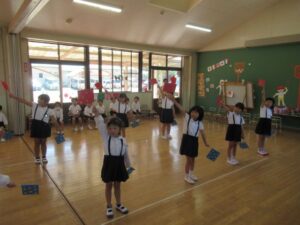 <年長組は年少組の旗体操>
